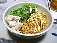 20時46分、晩ごはんはノンフライ麺の焼きそば風です。茹でた鶏団子&キャベツが付け合わせ。