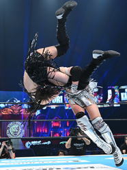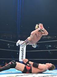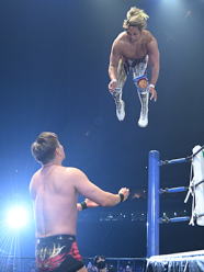 | 現役最後のハイフライアタックを浴びせる棚橋選手。 |