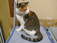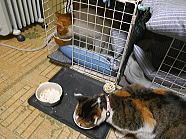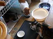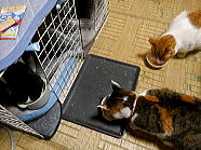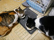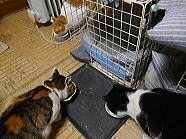 | 7時38分、ミィミィとチャーとコロの朝ごはんタイムです。 |