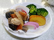 | 11時22分、ブランチはおせち料理です。筑前煮、煮豚、蒲鉾、伊達巻、茹でたブロッコリーと縁起物勢ぞろい。ご馳走様でした。 |