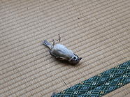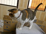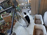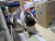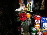 | 猫たちが食事が終えた後、仏花の水を換えました。 |