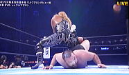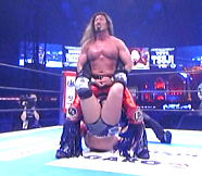 | ツームストン・パイルドライバー、レインメーカー、そして逆エビ固め。オカダ選手の猛攻を凌ぐ棚橋選手。 |