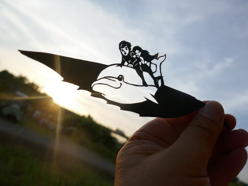 ●『海底少年マリン』の主人公のマリン、ヒロインのネプティーナ、白いイルカののホワイティの葉っぱアートです。
