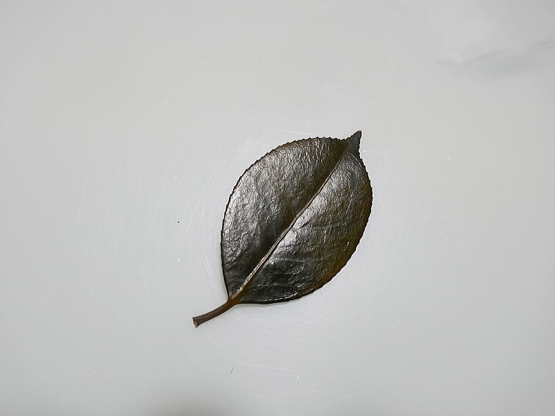 今回使用したのは、庭で採取した椿の葉を、5日間グリセリン水溶液に浸け、5日間 押し葉にしたものです。