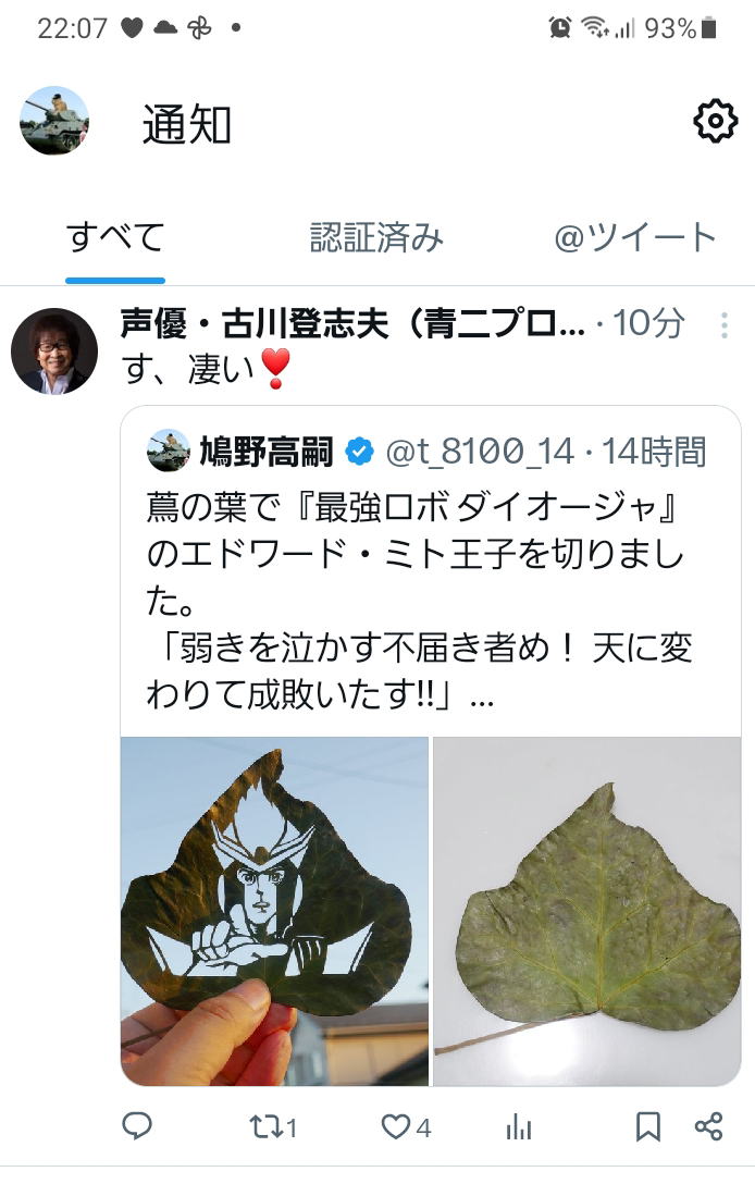 この葉っぱアートをアップした夜、古川登志夫さんにX (旧Twitter) でリポストして頂きました。