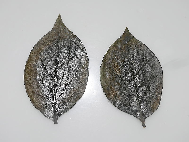 今回使用したのは、近所で採取した柿の葉を、5日間グリセリン水溶液に浸け、5日間 押し葉にしたものです。