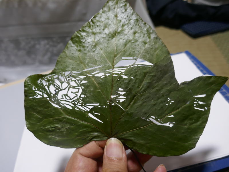 今回使用したのは、プリントライフの近くで採取した蔦の葉を、5日間グリセリン水溶液に浸け、