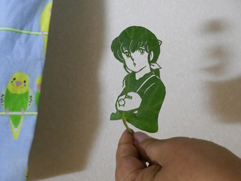 ●『めぞん一刻』のヒロイン、音無響子の葉っぱアートです。 (UP-DATE:2025.09.28) 音無響子の声は島本須美さんでしたね。透明感のある声が素敵でした。 ラミネート加工する際にエプロンのひよこの足が1本もげてしまったのが残念。 保存のリスクは0で無いという事ですね。 今回使用したのは、実家の近所で採取した蔦の葉を、3日間グリセリン水溶液に浸け、 3日間 押し葉にしたものです。 このページの先頭へ
