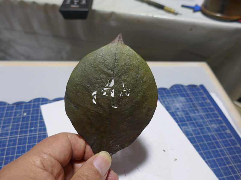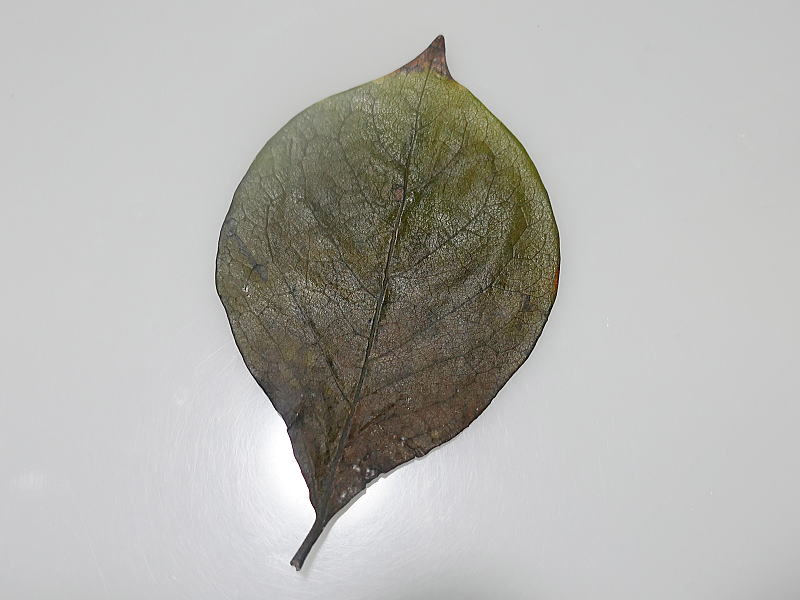 今回使用したのは、ウエルシア薬局・箱田二丁目店の近所で採取した柿の葉を、5日間グリセリン水溶液に浸け、