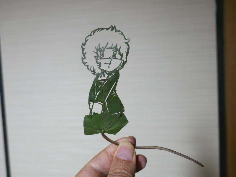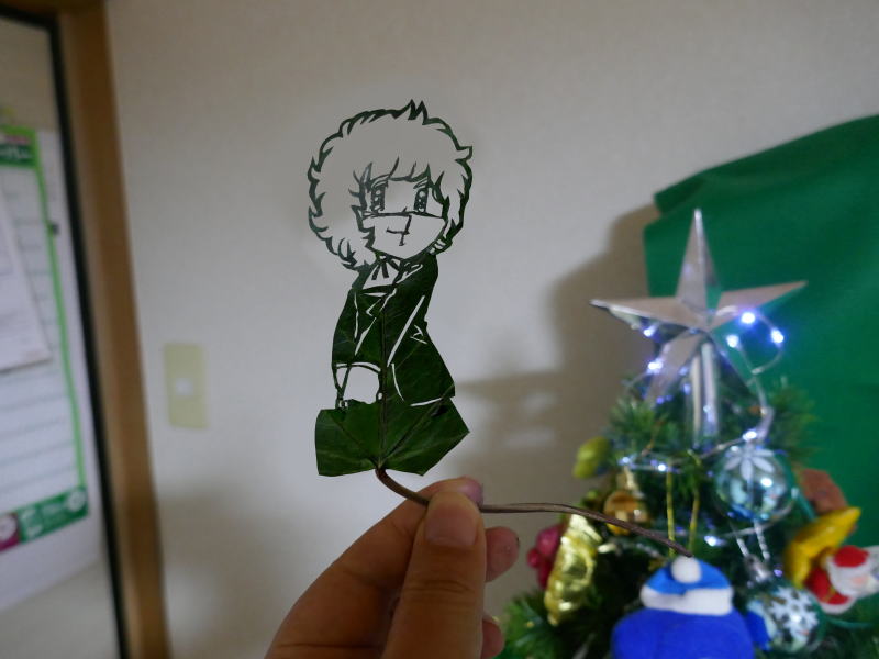 ●『すくらっぷ・ブック』に登場いる葵多寿子 (通称:ターコ) を切りました。 (UP-DATE:2025.12.21) 髪の線は太すぎても細すぎても自重で倒れるので、絶妙の太さにするのが大変でしたね。 今回使用したのは、プリントライフの近所で採取した大きめの蔦の葉を、5日間グリセリン水溶液に浸け、 8日間 押し葉にしたものです。 せっかくなのでクリスマスツリーの前でも写真を撮りました。 このページの先頭へ