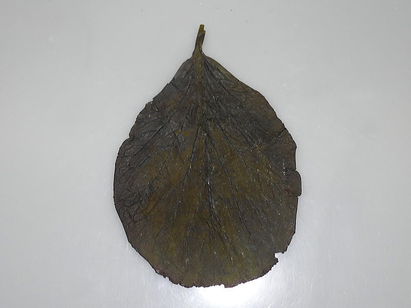 今回使用したのは、近所で採取したヒマラヤユキノシタの葉を、14日間グリセリン水溶液に浸け、