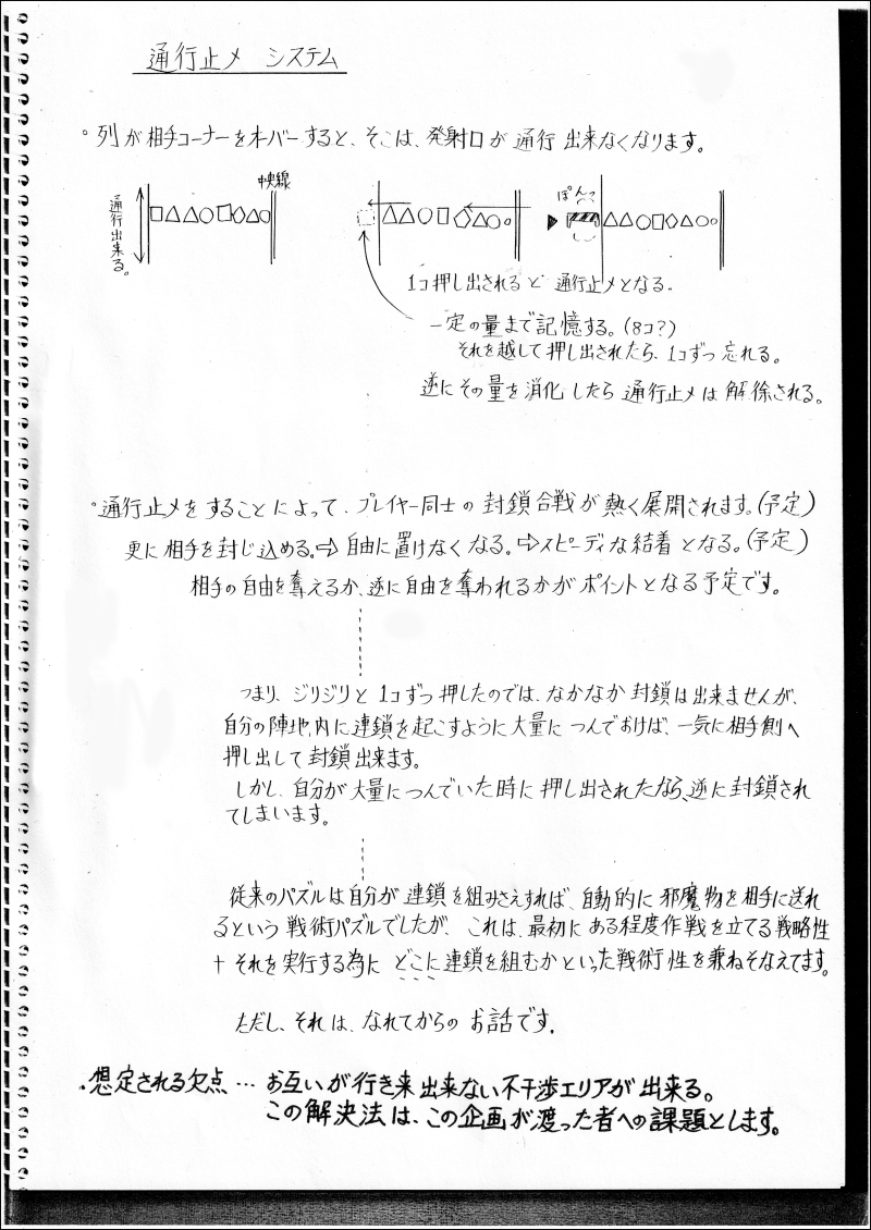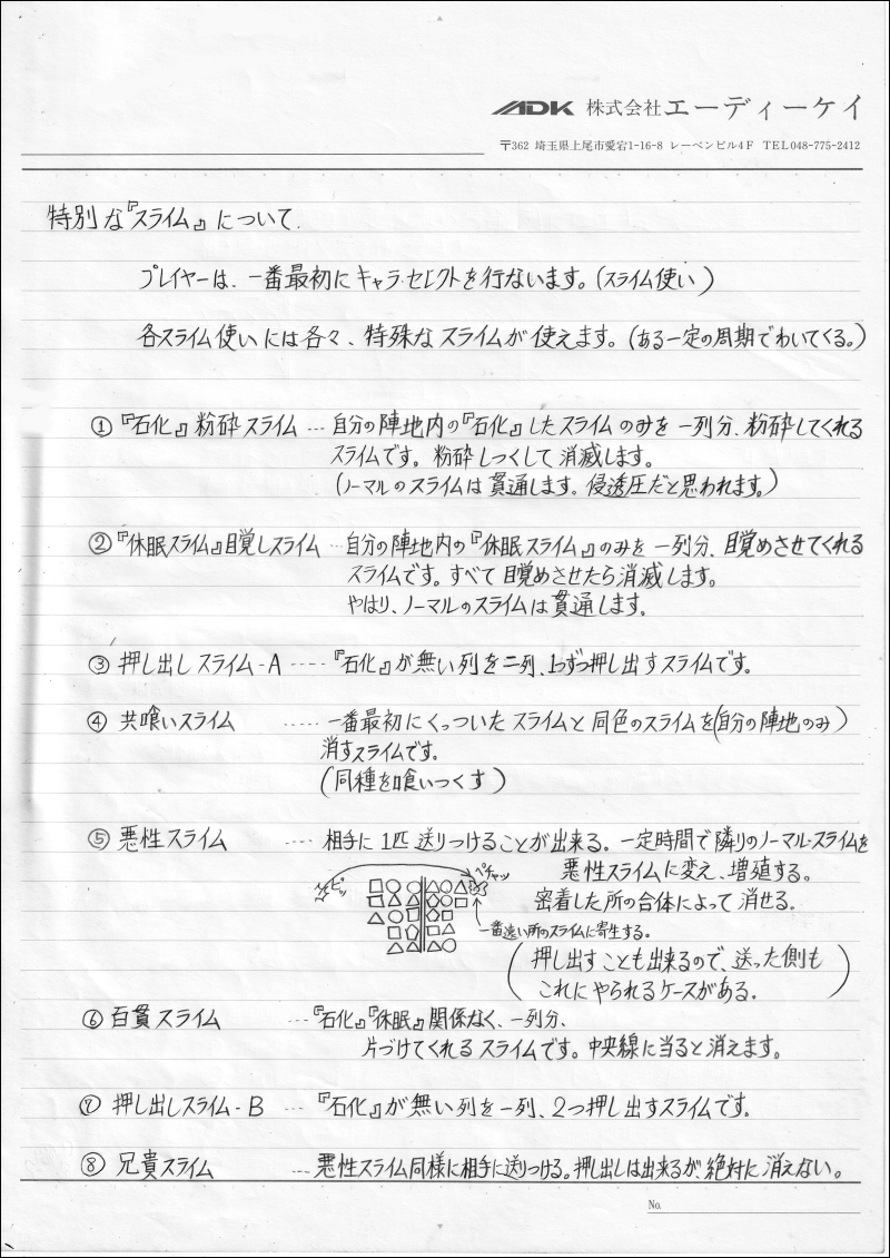 新人のプランナーの企画書から残っているのは、『数色のスライムを使って横画面で対戦する』要素のみですが、